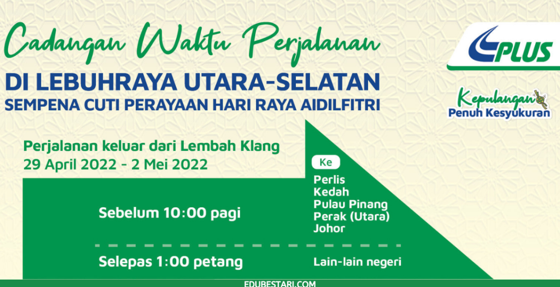 Ikuti perkongsian di bawah untuk maklumat cuti sempena Hari Raya Aidilfitri dan cadangan waktu perjalanan yang dikeluarkan oleh PLUS.