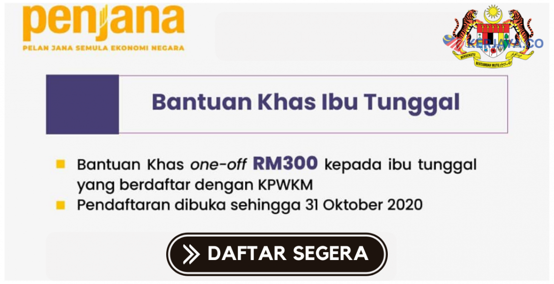 Selain daripada berdaftar dengan JKM, ibu tunggal juga perlu berdaftar dengan KPWKM untuk melayakkan diri menerima bantuan RM300. Pendaftaran ini dibuka sehingga 31 Oktober 2020.