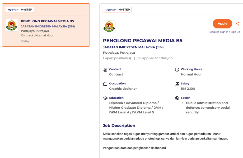 Peluang kerja kontrak kerajaan melalui program MySTEP kini dibuka di Jabatan Imigresen Malaysia (JIM) bagi jawatan Penolong Pegawai Media B5.