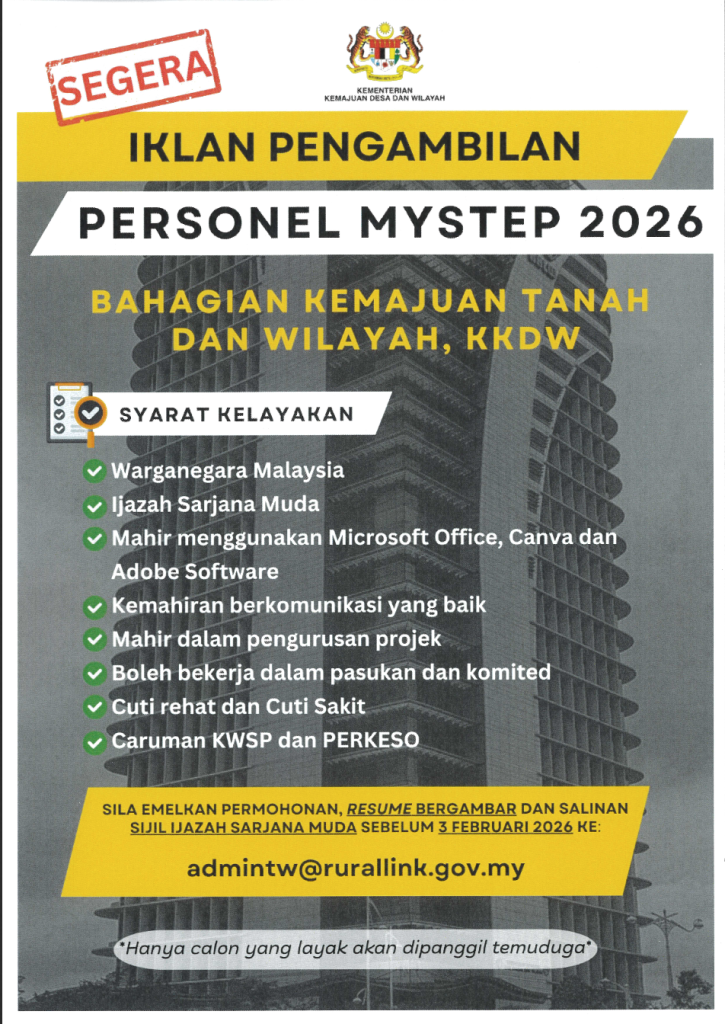 Bahagian Kemajuan Tanah dan Wilayah, Kementerian Kemajuan Desa dan Wilayah (KKDW) kini membuka pengambilan Personel MySTEP 2026 dengan kadar bayaran RM2,300 sebulan.