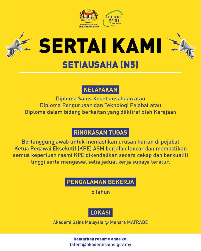Jawatan Setiausaha (Gred N5) di Akademi Sains Malaysia (ASM) merupakan peluang kerjaya yang sangat baik untuk calon berpengalaman dalam bidang kesetiausahaan dan pentadbiran. Dengan penempatan di Menara MATRADE serta peranan sokongan kepada pengurusan tertinggi, jawatan ini sesuai untuk individu yang cekap, berdisiplin dan profesional.