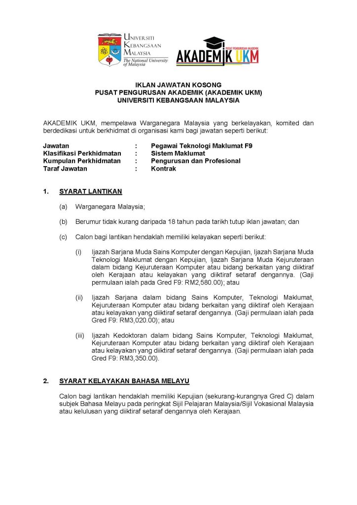 Dengan hormatnya saya merujuk kepada iklan jawatan yang disiarkan oleh pihak tuan/puan bagi jawatan Pegawai Teknologi Maklumat F9 di Pusat Pengurusan Akademik UKM.