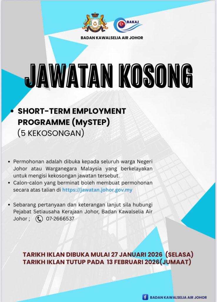 Badan Kawalselia Air Johor (BAKAJ) di bawah Pejabat Setiausaha Kerajaan Johor membuka Short-Term Employment Programme (MySTEP) kepada calon berkelayakan setaraf SPM bagi penempatan di Kota Iskandar, Iskandar Puteri.