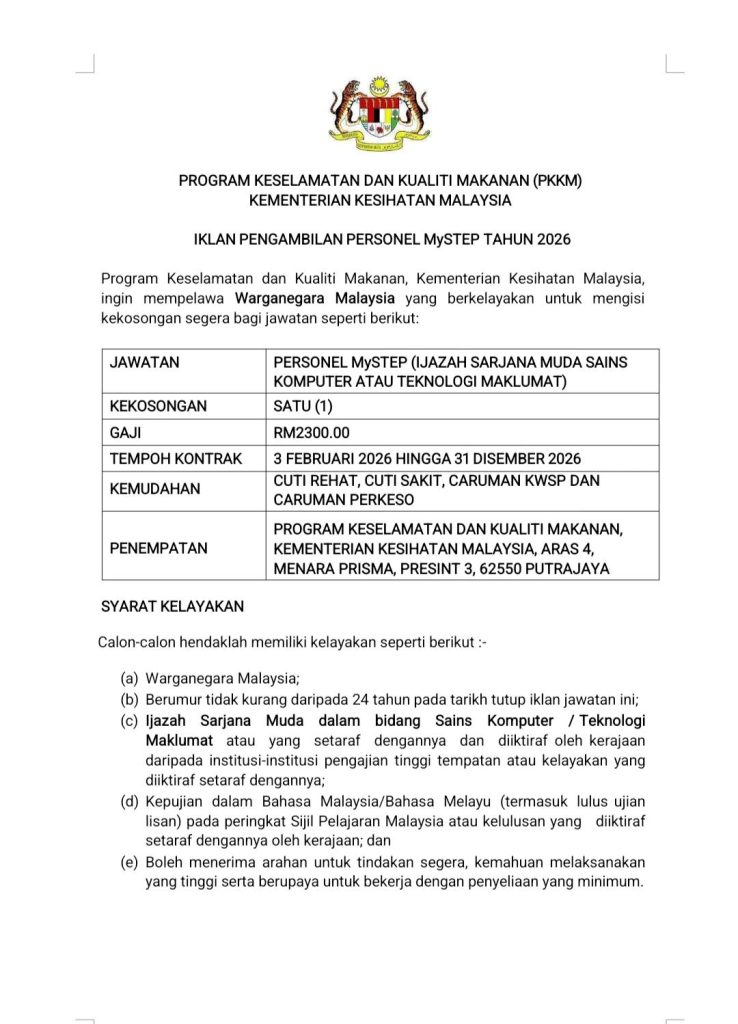 Program Keselamatan dan Kualiti Makanan (PKKM), Kementerian Kesihatan Malaysia (KKM) kini membuka pengambilan Personel MySTEP Tahun 2026 bagi calon berkelayakan dalam bidang Sains Komputer / Teknologi Maklumat.