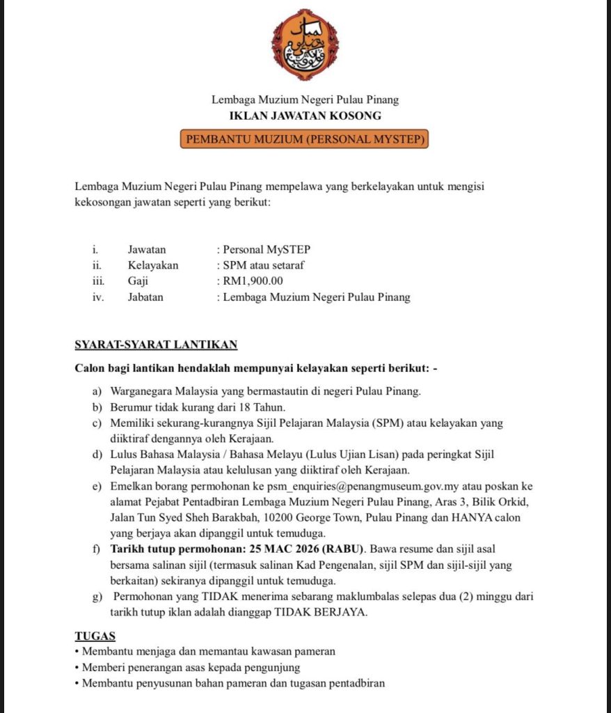 Maklumat Jawatan Kosong Lembaga Muzium Negeri Pulau Pinang