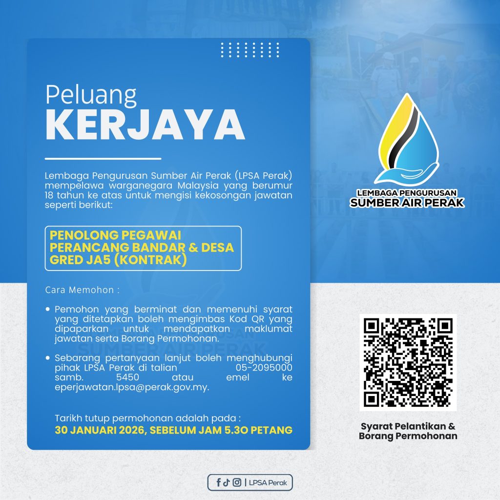 Lembaga Pengurusan Sumber Air Perak (LPSA Perak) mempelawa warganegara Malaysia yang berumur 18 tahun ke atas untuk mengisi kekosongan jawatan secara kontrak bagi tahun 2026.