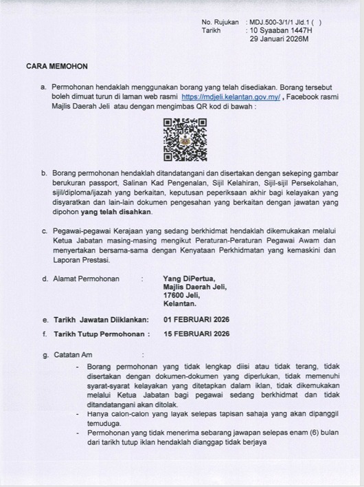 - Borang boleh dimuat turun di laman web rasmi: https://mdjeli.kelantan.gov.my/ atau melalui Facebook rasmi MDJ / imbas QR pada iklan.