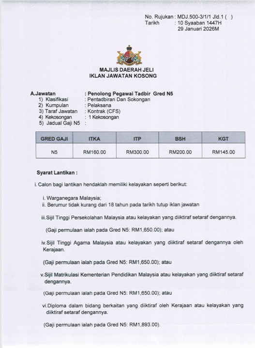 Jika anda benar-benar berminat berkhidmat di PBT dan mempunyai kelayakan yang dinyatakan, peluang di Majlis Daerah Jeli ini wajar dipohon segera. Pastikan anda gunakan borang rasmi, sediakan dokumen lengkap, dan tonjolkan pengalaman yang relevan dengan tugas jawatan.