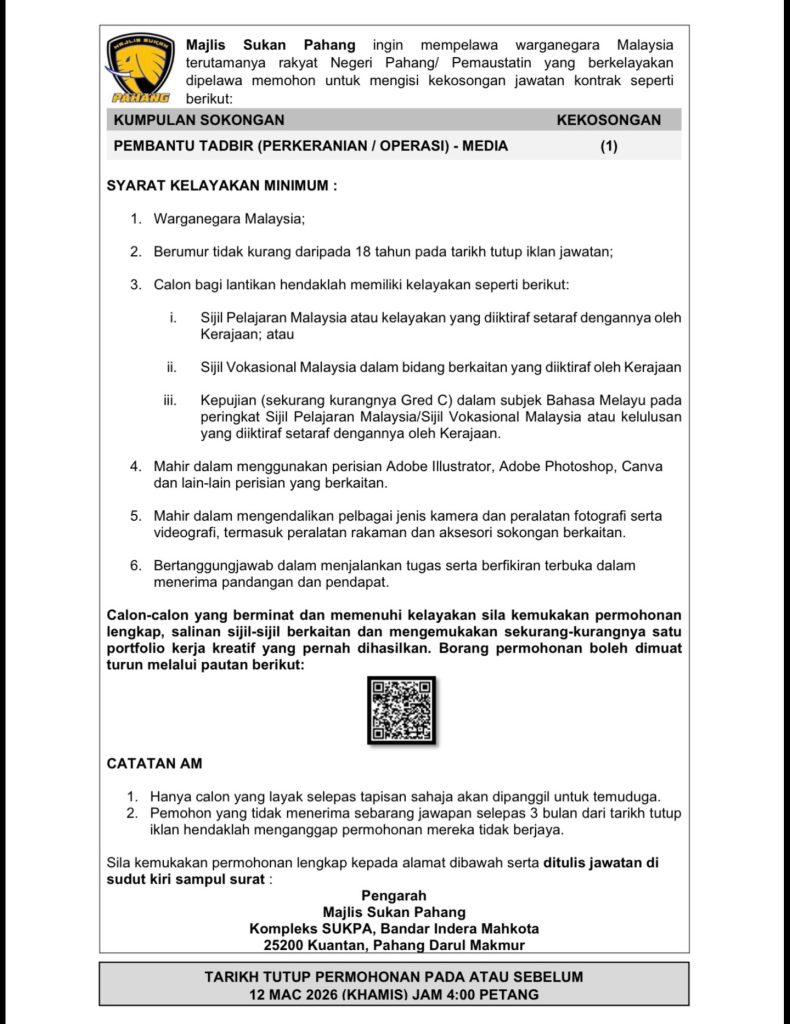 Majlis Sukan Pahang membuka peluang kerjaya kepada warganegara Malaysia yang berkelayakan, khususnya individu yang mempunyai kemahiran media, grafik, fotografi dan videografi untuk mengisi satu kekosongan jawatan kontrak bagi tahun 2026. Peluang ini amat sesuai untuk lepasan SPM / SVM yang aktif dalam bidang kreatif dan ingin membina pengalaman bekerja dalam organisasi kerajaan negeri.