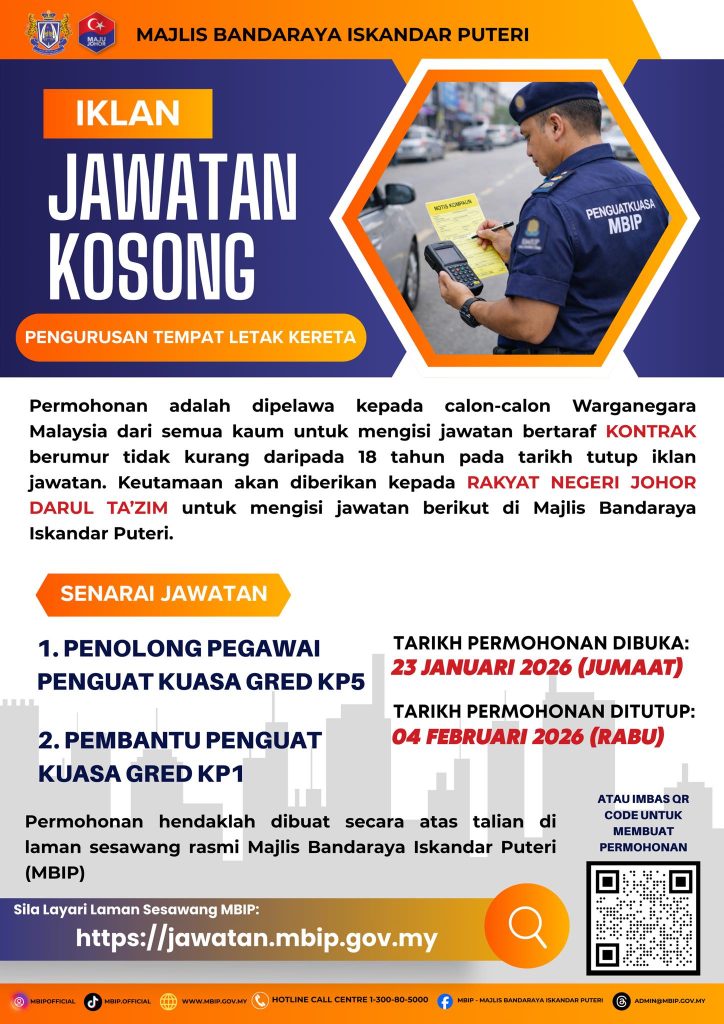 Majlis Bandaraya Iskandar Puteri (MBIP) membuka peluang kerjaya dalam bidang Pengurusan Tempat Letak Kereta bagi tahun 2026. Permohonan adalah secara atas talian dan terbuka kepada warganegara Malaysia berumur 18 tahun ke atas, dengan keutamaan kepada rakyat Negeri Johor Darul Ta’zim.