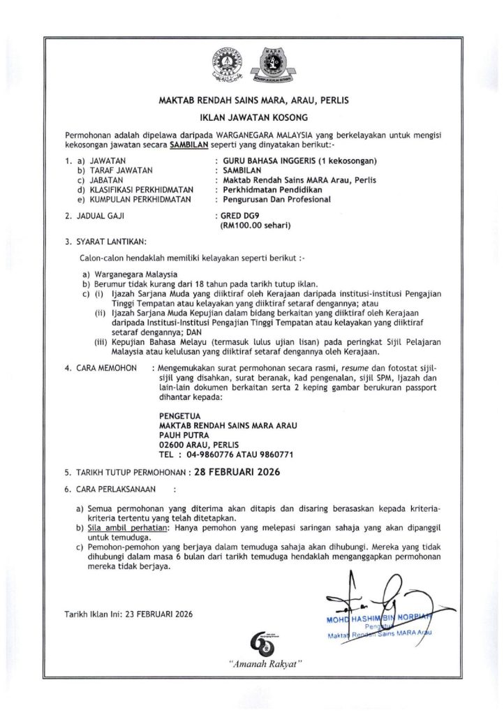 Jawatan Guru Bahasa Inggeris Sambilan DG9 di MRSM Arau ini merupakan peluang baik kepada graduan pendidikan dan Bahasa Inggeris untuk menimba pengalaman di institusi MARA yang berprestij. Pastikan permohonan lengkap dihantar sebelum 28 Februari 2026.