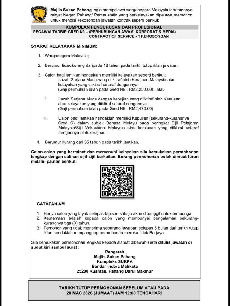 Jawatan Kosong Majlis Sukan Pahang 2026 – Pegawai Tadbir Gred N9 (Perhubungan Awam, Korporat & Media)