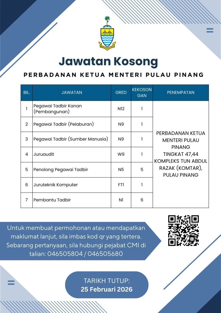 Berita baik kepada pencari kerja yang berminat membina kerjaya dalam organisasi berkaitan kerajaan negeri. Perbadanan Ketua Menteri Pulau Pinang kini membuka pelbagai jawatan kosong bagi tahun 2026, melibatkan jawatan sokongan, teknikal dan pengurusan.