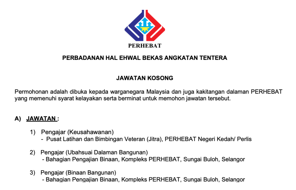 Perbadanan Hal Ehwal Bekas Angkatan Tentera (PERHEBAT) membuka peluang kerjaya kepada calon yang berkelayakan untuk mengisi jawatan Pengajar dalam bidang keusahawanan dan pembinaan.