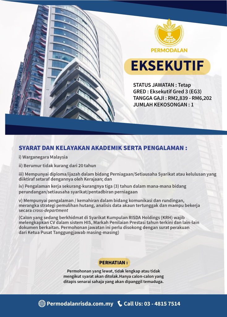 Jawatan Eksekutif di Permodalan RISDA Berhad merupakan peluang kerjaya stabil, berstatus tetap dan kompetitif, khusus untuk calon berpengalaman yang serius membina masa depan dalam organisasi berkaitan agensi kerajaan.