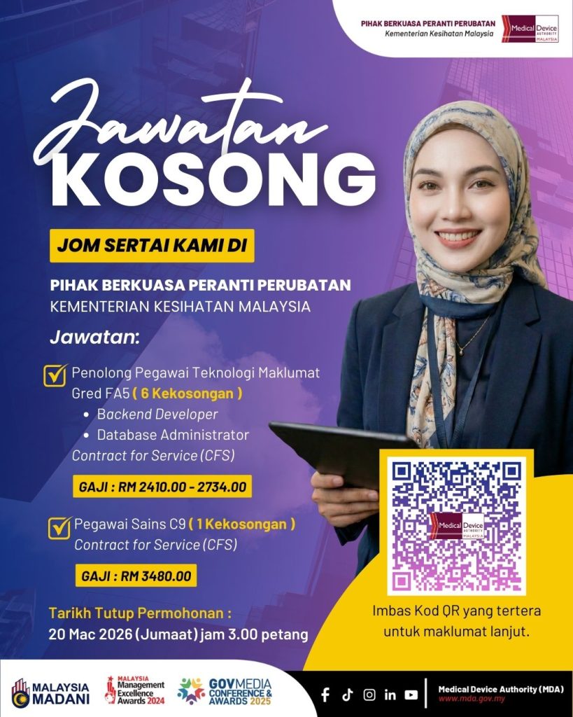 Pihak Berkuasa Peranti Perubatan (Medical Device Authority – MDA) di bawah Kementerian Kesihatan Malaysia (KKM) kini membuka peluang kerjaya kepada warganegara Malaysia yang berkelayakan untuk mengisi beberapa kekosongan jawatan teknikal dan profesional.