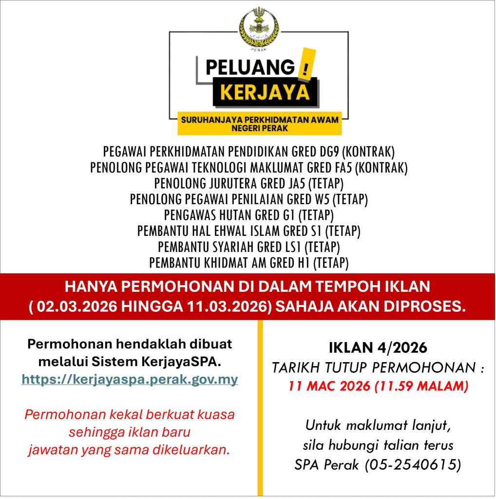 Jawatan kosong SPA Negeri Perak 2026 ini merupakan peluang penting untuk calon yang ingin membina kerjaya stabil dalam sektor awam. Dengan tempoh permohonan yang singkat, calon disarankan tidak bertangguh dan memastikan maklumat permohonan lengkap serta tepat.