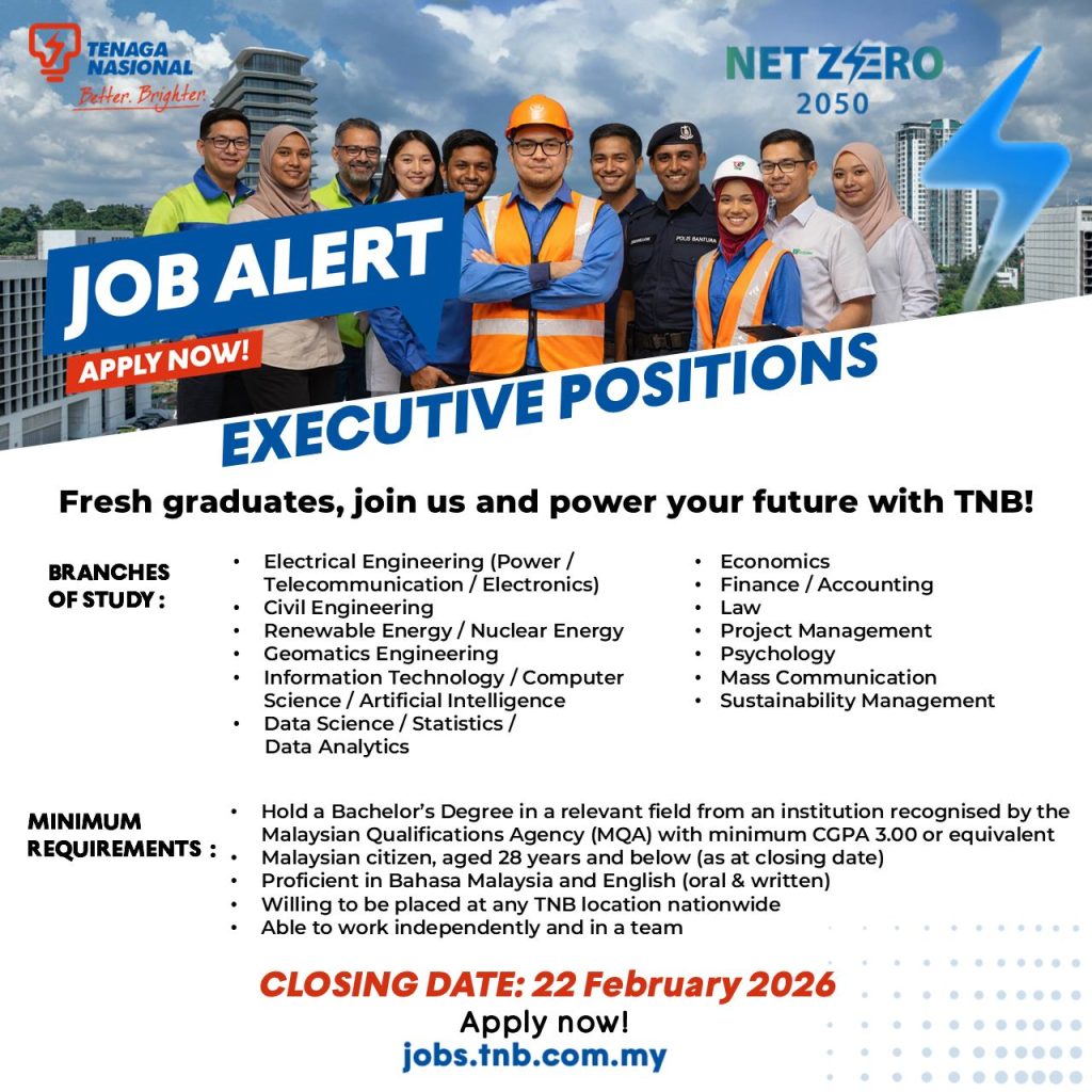 Berita baik kepada graduan baharu! Tenaga Nasional Berhad (TNB) membuka Executive Positions untuk pengambilan besar-besaran tahun 2026. Iklan ini mensasarkan fresh graduates berprestasi daripada pelbagai bidang untuk menyertai organisasi utiliti elektrik terbesar negara.