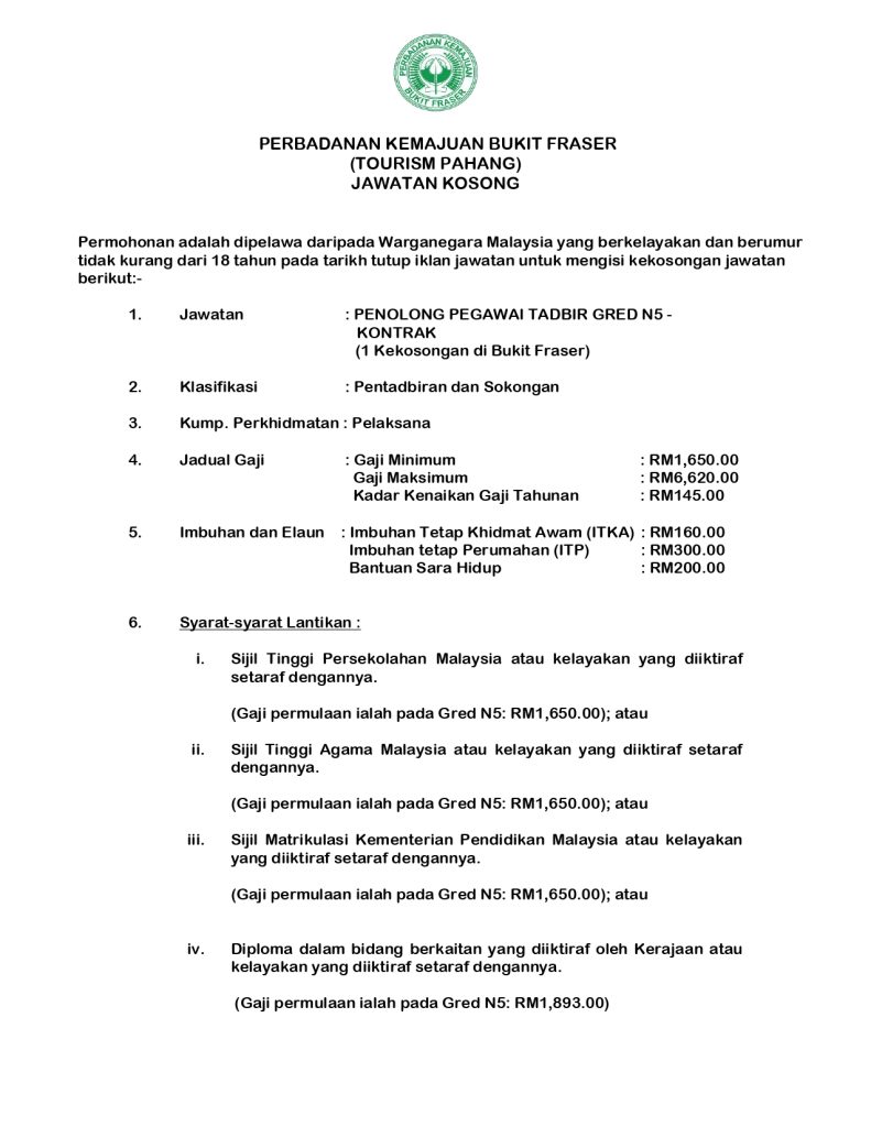 Berita baik kepada pencari kerja sektor kerajaan dan pelaksana yang berpengalaman. Perbadanan Kemajuan Bukit Fraser (Tourism Pahang) kini membuka jawatan Penolong Pegawai Tadbir Gred N5 untuk penempatan di Bukit Fraser.