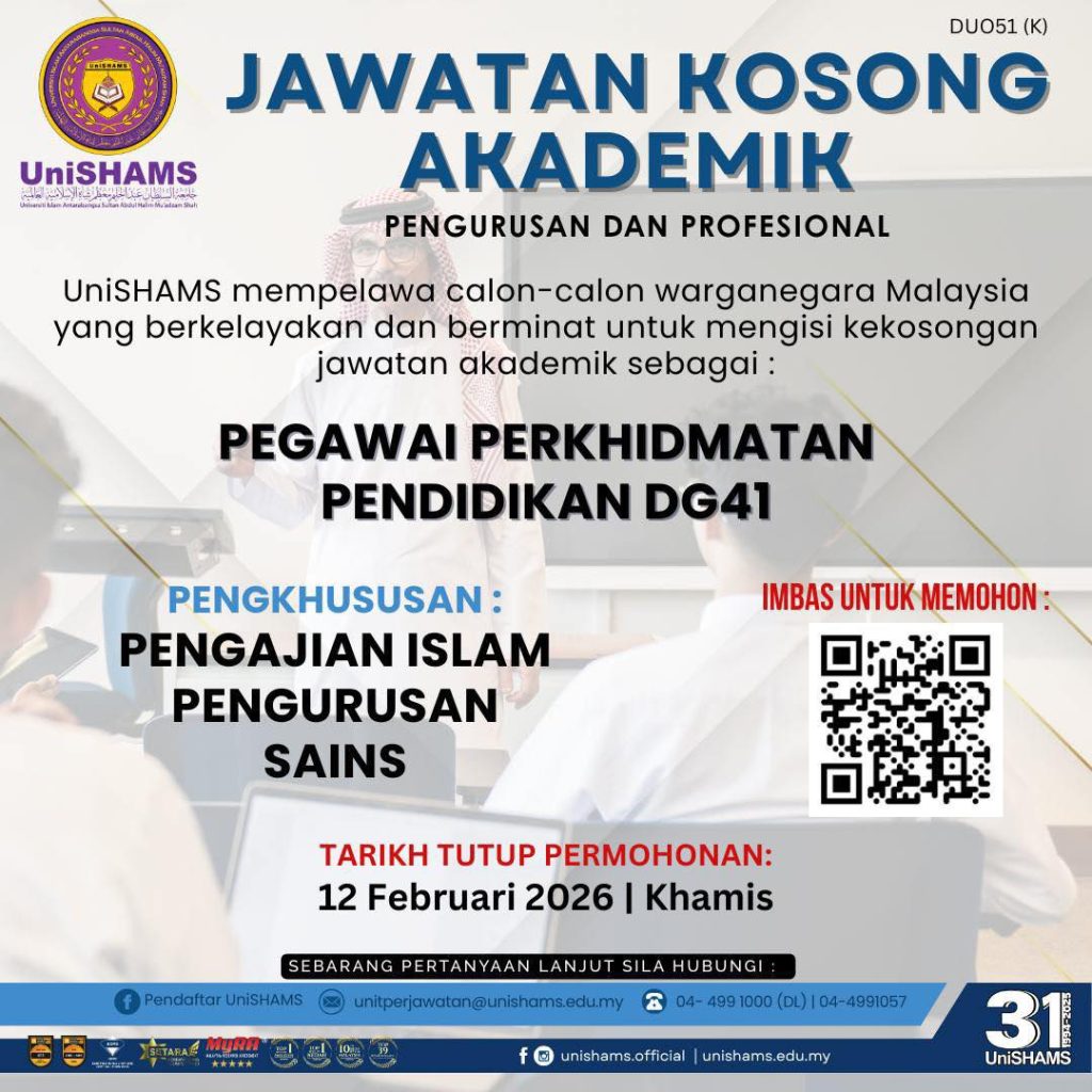 Jawatan Kosong Akademik DG41 di Universiti Islam Antarabangsa Sultan Abdul Halim Mu’adzam Shah (UniSHAMS) – Mohon Sebelum 12 Februari 2026