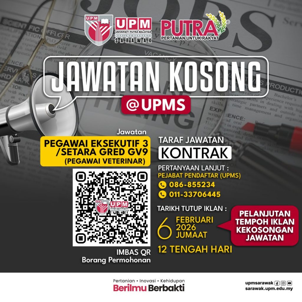 Universiti Putra Malaysia Sarawak (UPMS) membuka peluang kerjaya bagi jawatan Pegawai Eksekutif 3 setara Gred GV9 dalam bidang Pegawai Veterinar secara kontrak.