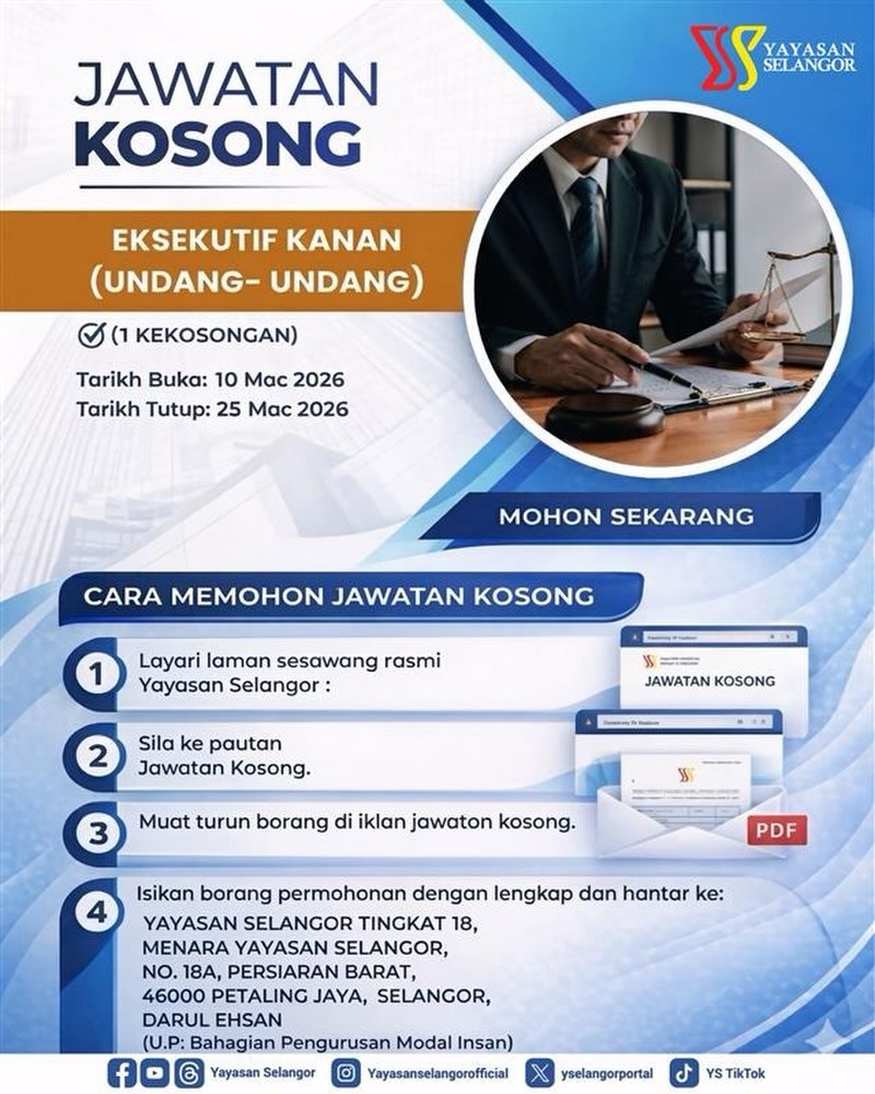 Jawatan Penyelia Kewangan di Yayasan Selangor ini merupakan peluang baik kepada calon berpengalaman dalam bidang kewangan untuk berkhidmat dalam organisasi yang berfokus kepada pembangunan pendidikan dan kebajikan. Pastikan permohonan lengkap dihantar sebelum 9 Februari 2026.