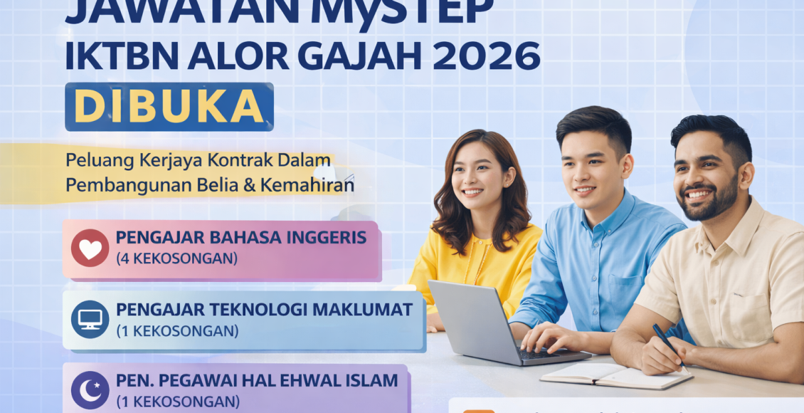 Ringkas & Penting: Pengambilan MySTEP oleh IKTBN Alor Gajah (KBS) untuk jawatan pengajaran & sokongan akademik. Permohonan dihantar melalui emel dengan resume bergambar. Tarikh tutup: 20 Januari 2026 (Selasa).