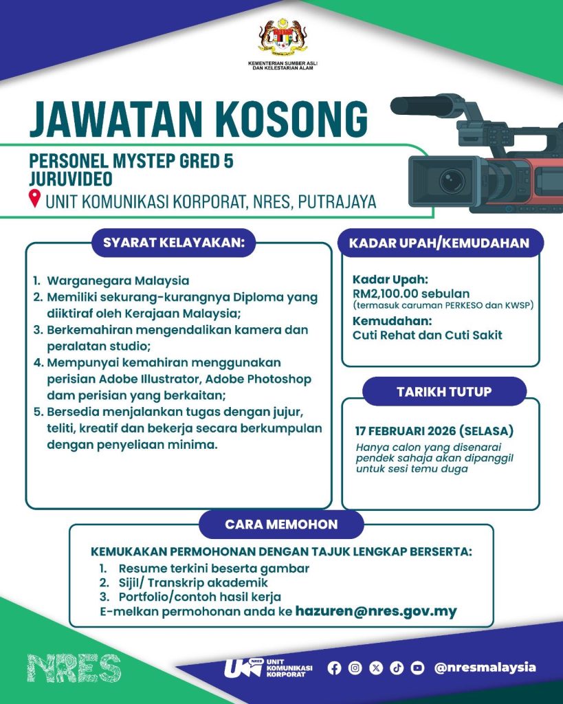 Berita baik kepada calon yang mempunyai kemahiran multimedia, videografi, reka grafik dan pengurusan media sosial. Kementerian Sumber Asli dan Kelestarian Alam (NRES) kini membuka dua kekosongan Personel MySTEP di Unit Komunikasi Korporat, Putrajaya.