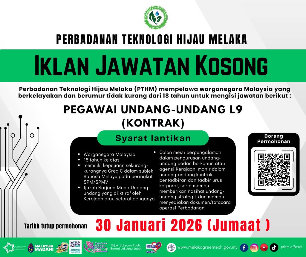 Perbadanan Teknologi Hijau Melaka (PTHM) mempelawa warganegara Malaysia yang berkelayakan untuk mengisi jawatan Pegawai Undang-Undang Gred L9 secara kontrak. Peluang ini sangat sesuai untuk graduan undang-undang yang mempunyai pengalaman dalam tadbir urus korporat, undang-undang kontrak serta pengurusan perundangan di agensi kerajaan atau badan berkanun.