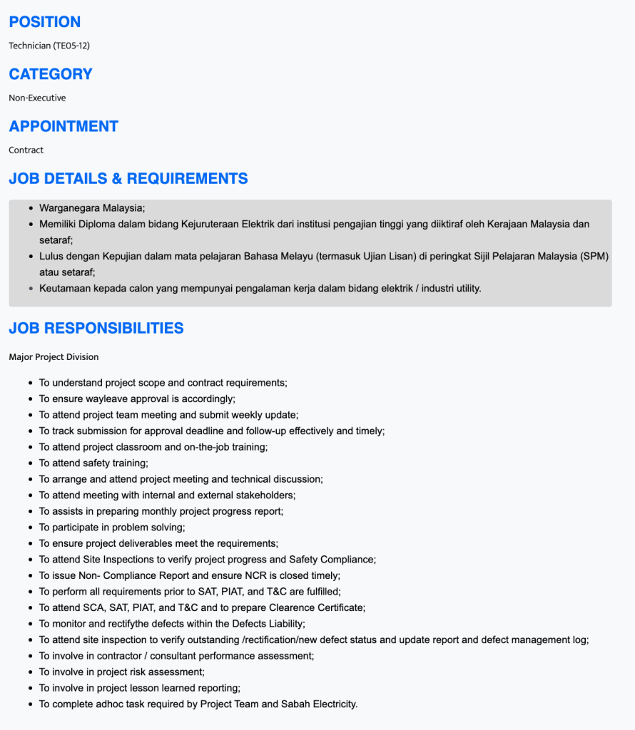 Jawatan Technician (TE05–12) SESB merupakan peluang bernilai tinggi untuk lepasan diploma yang ingin membina kerjaya dalam projek utiliti dan infrastruktur berskala besar. Selain pengalaman teknikal, jawatan ini memberi pendedahan kepada pengurusan projek, keselamatan, pematuhan dan dokumentasi profesional.