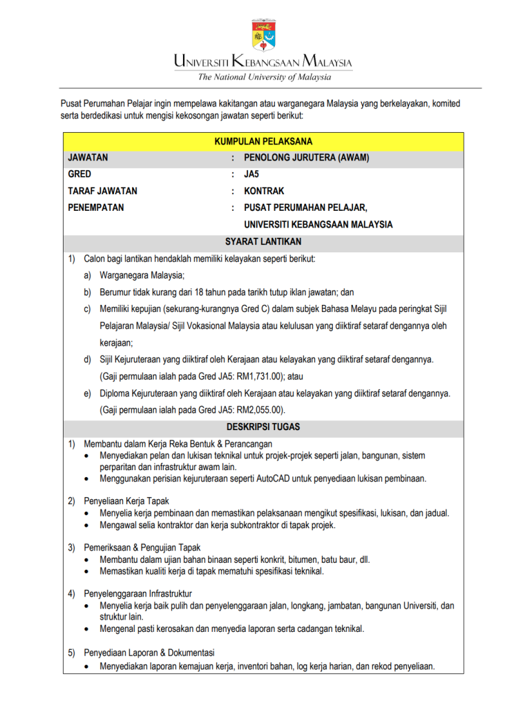 Universiti Kebangsaan Malaysia (UKM) melalui Pusat Perumahan Pelajar (PPP) kini membuka peluang kerjaya bagi Kumpulan Pelaksana untuk mengisi jawatan Penolong Jurutera (Awam) Gred JA5 secara lantikan kontrak.
