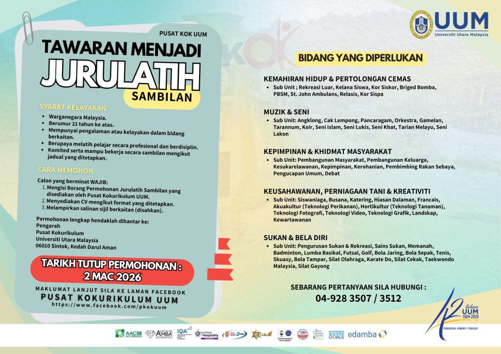 Jawatan Jurulatih Sambilan Pusat Kokurikulum Universiti Utara Malaysia (UUM) 2026 Dibuka