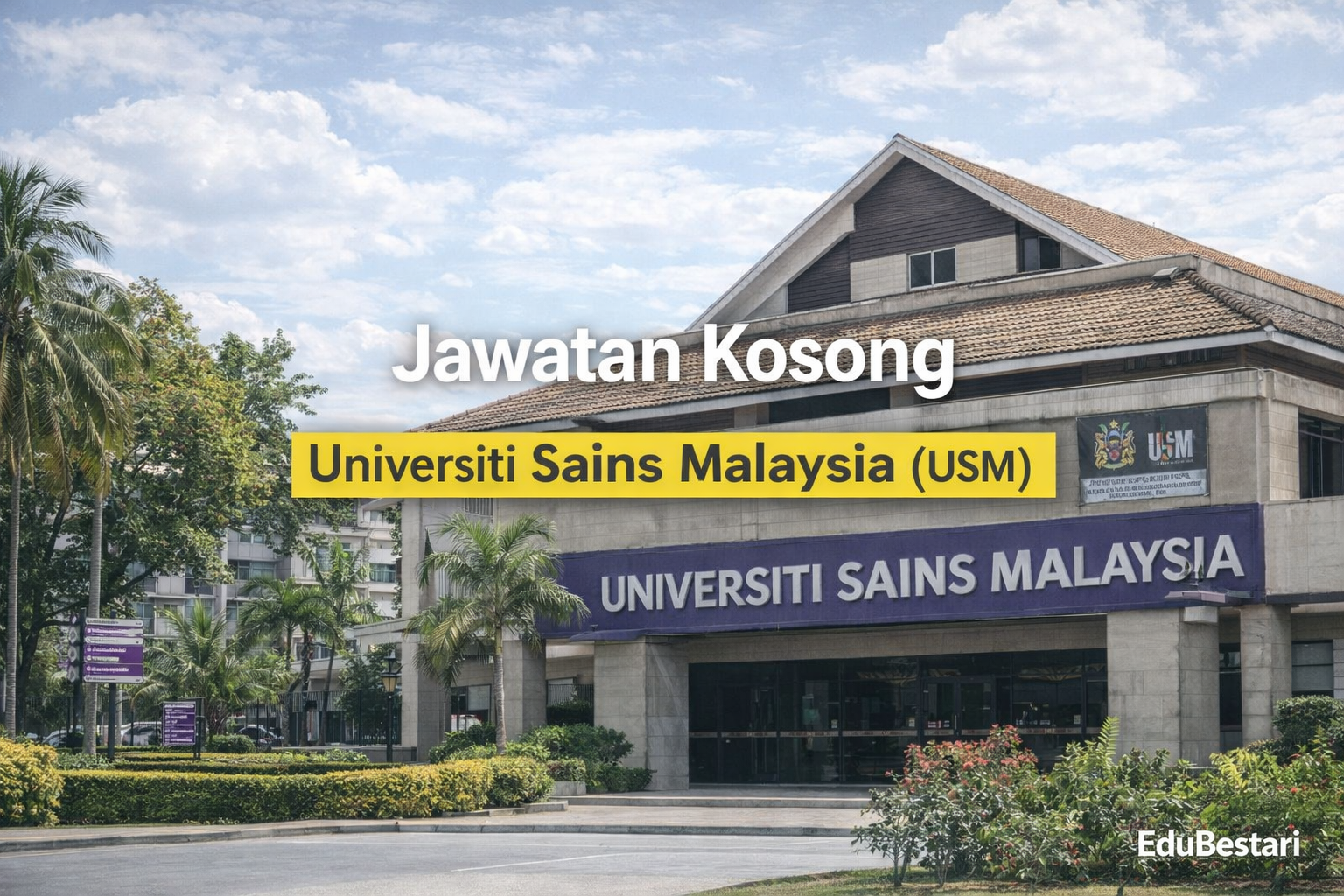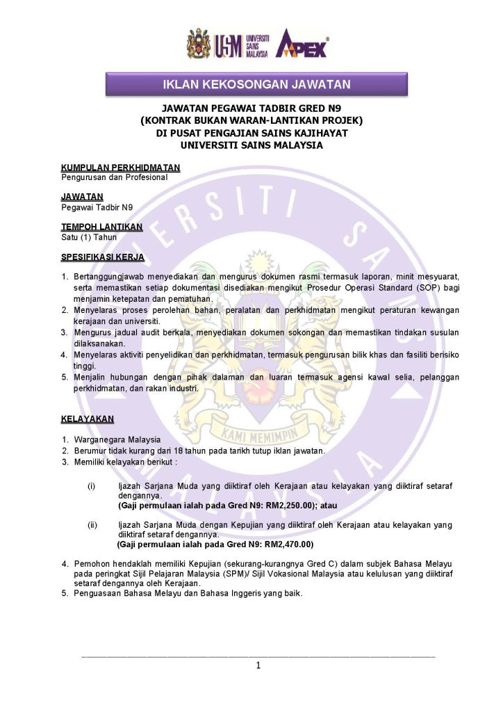 Peluang kerjaya profesional dibuka di universiti awam terkemuka negara. Universiti Sains Malaysia (USM) kini mempelawa Warganegara Malaysia yang berkelayakan untuk mengisi jawatan Pegawai Tadbir Gred N9 secara kontrak (bukan waran, bukan lantikan projek) di Pusat Pengajian Sains Kajihayat.