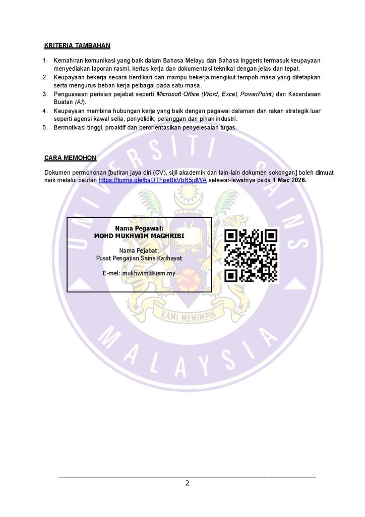 Calon perlu bersedia bekerja dalam persekitaran universiti awam yang menekankan pematuhan prosedur, audit dan dokumentasi rasmi.