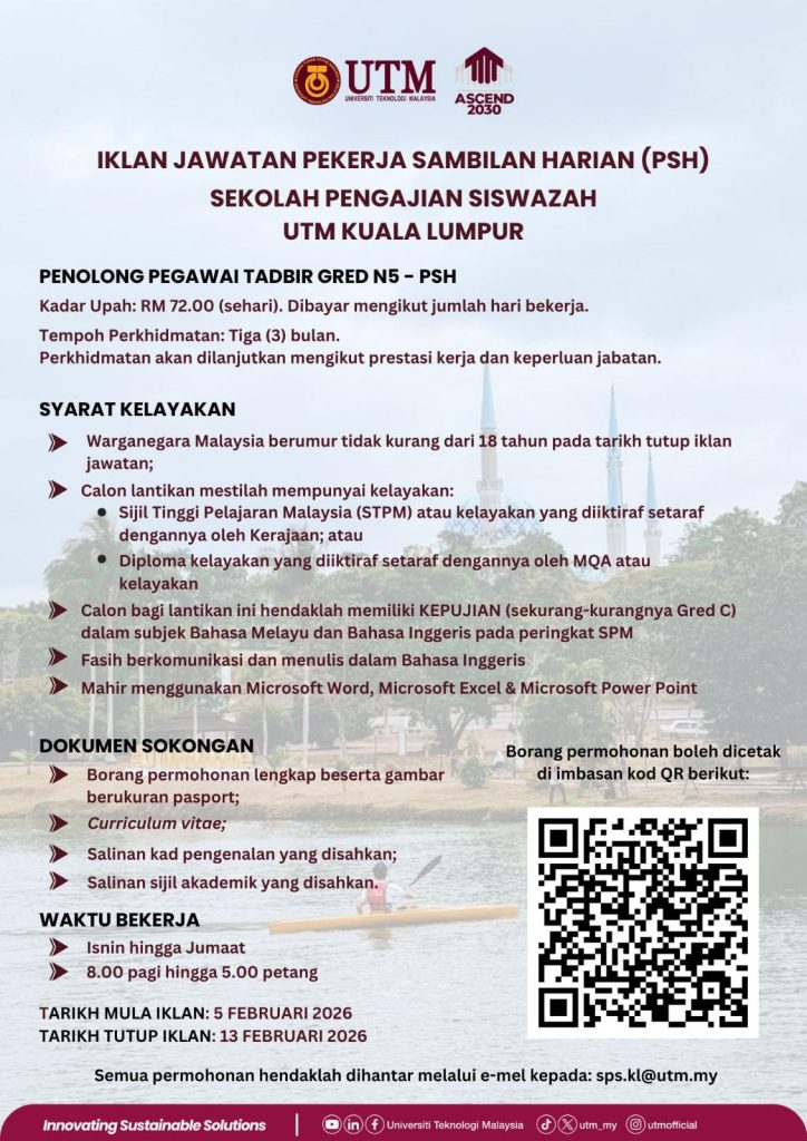 Berita baik kepada lepasan STPM/Diploma yang mahu pengalaman pentadbiran di universiti awam. Sekolah Pengajian Siswazah, UTM Kuala Lumpur membuka Pekerja Sambilan Harian (PSH) bagi jawatan Penolong Pegawai Tadbir Gred N5 dengan tempoh 3 bulan dan potensi sambungan berdasarkan prestasi.