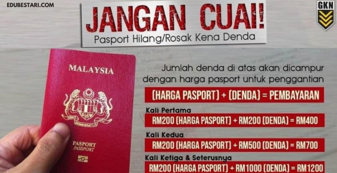 Jangan sesekali cuai! Tahu tak, sekiranya anda kehilangan pasport atau pasport anda rosak, anda boleh dikenakan denda sehingga RM1,200! Anda bukan sahaja perlu bayar harga denda, anda juga perlu bayar sekali harga Pasport Malaysia Antarabangsa (PMA) yang baharu! Jumlah denda akan dicampur dengan harga pasport untuk penggantian.