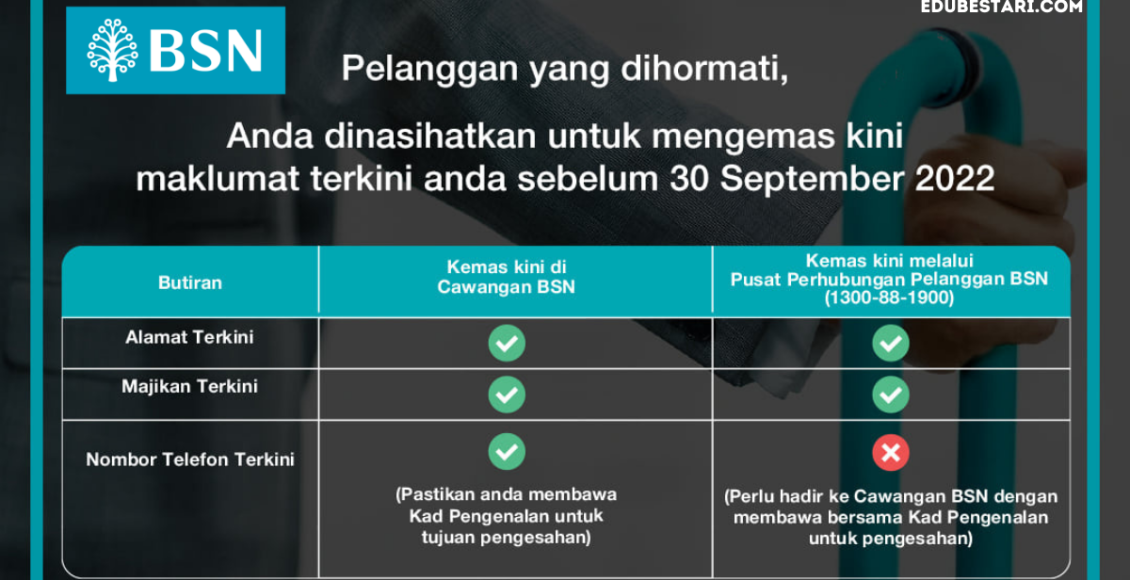 Pelanggan Bank Simpanan Nasional (BSN) dinasihatkan untuk mengemas kini maklumat terkini sebelum 30 September 2022 di mana-mana Cawangan BSN yang berhampiran atau menghubungi Pusat Perhubungan Pelanggan BSN di talian dinyatakan.