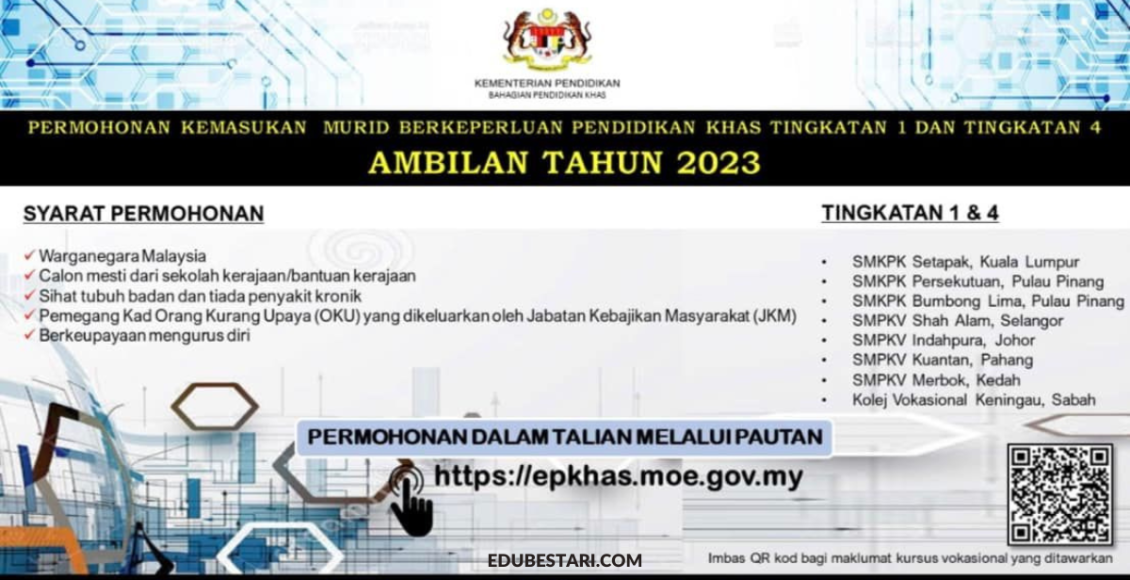 Sukacita dimaklumkan Kementerian Pendidikan Malaysia kini telah membuka Permohonan Kemasukan Murid Bekeperluan Pendidikan Khas (MBPK) Tingkatan 1 dan Tingkatan 4 Ambilan Tahun 2023 dibuka mulai 4 September 2022. Ibu bapa yang berminat nak daftarkan anak yang merupakan pemegang kad OKU boleh buat permohonan sekarang.