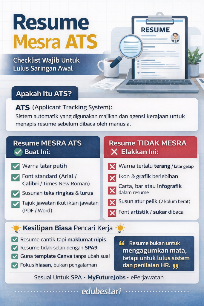 Artikel ini menghuraikan sebab kenapa resume yang ringkas, profesional dan mesra sistem masih menjadi pilihan utama kebanyakan majikan — terutamanya dalam sektor kerajaan dan syarikat korporat besar di Malaysia.