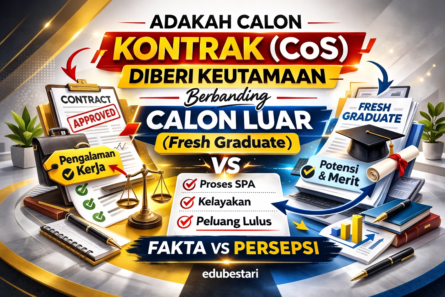 Persoalan sama ada calon kontrak sedia ada (Contract of Service – CoS) diberi keutamaan berbanding calon luar atau fresh graduate sering menjadi topik hangat dalam kalangan pencari kerja sektor awam. Ramai fresh grad berasa peluang mereka tipis kerana bersaing dengan calon yang sudah mempunyai pengalaman bekerja dalam agensi kerajaan.