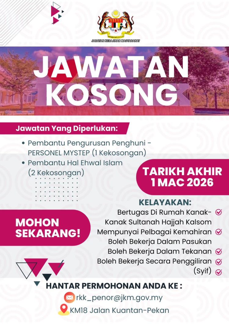 Jabatan Kebajikan Masyarakat (JKM) kini membuka peluang kerjaya kepada warganegara Malaysia yang berminat untuk berkhidmat dalam bidang kebajikan dan sosial. Peluang ini melibatkan penempatan di Rumah Kanak-Kanak Sultanah Hajjah Kalsom, dengan beberapa kekosongan jawatan ditawarkan bagi tahun 2026.