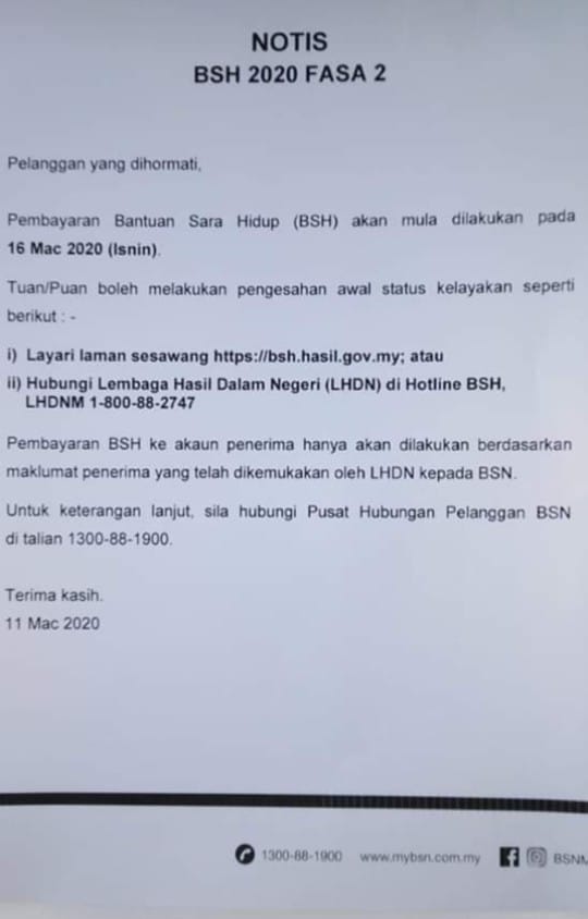 Bermula hari ini 15 Mac 2020, bayaran sebanyak RM200 untuk BSH fasa 2 warga emas telahpun diagihkan. Bayaran diterima kebanyakkan di BSN (Bank Simpanan Nasional)