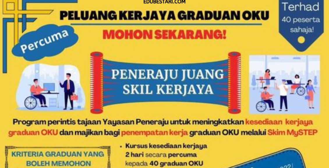Yayasan Peneraju Pendidikan Bumiputera ( Yayasan Peneraju) dengan kerjasama UKM akan menganjurkan kursus kesediaan kerjaya secara percuma kepada graduan OKU pada 15-16 Ogos 2022 & 17-18 Ogos 2022 di lokasi yang dinyatakan. Objektif program ini adalah untuk meningkatkan kesediaan kerjaya graduan OKU dan kesediaan majikan untuk penempatan kerja graduan OKU
