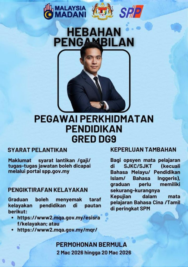 Suruhanjaya Perkhidmatan Pendidikan (SPP) mempelawa Graduan Pendidikan yang berkelayakan dan berminat untuk memohon jawatan Pegawai Perkhidmatan Pendidikan (PPP) Gred DG9 di bawah Kementerian Pendidikan Malaysia (KPM) bagi pengambilan tahun 2026.