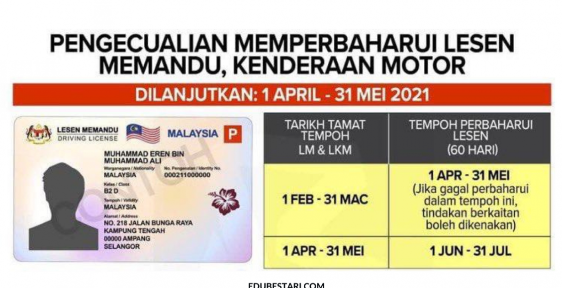 • Lesen memandu dan roadtax yang tamat tempoh pada mana-mana tarikh antara 1 April hingga 31 Mei 2021 pula hendaklah memperbaharuinya dalam tempoh 60 hari bermula 1 Jun sehingga 31 Julai 2021