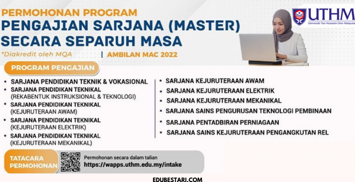 Universiti Tun Hussein Onn Malaysia (UTHM) membuka permohonan kemasukan Program Pengajian Sarjana (Master) secara separuh masa untuk ambilan Mac 2022. Sekiranya anda berminat, permohonan boleh dilakukan secara atas talian sehingga 31 Disember 2021 ini.