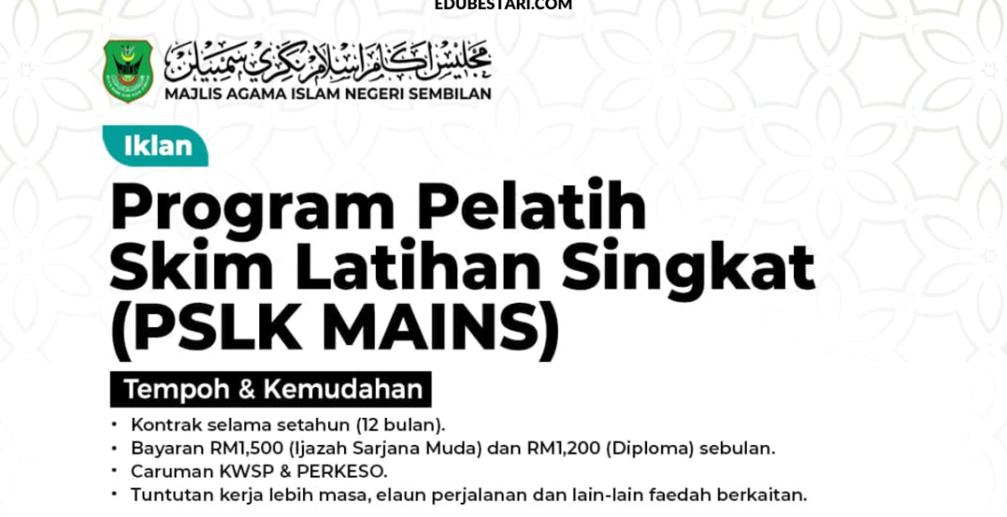 Graduan Diploma dan Ijazah Sarjana Muda yang telah menamatkan pengajian di IPT Timur Tengah dan IPT tempatan sesi 2020/2021 dan 2022 yang telah menerima surat senat adalah dipelawa untuk menyertai Program Pelatih Skim Latihan Singkat (PSLK MAINS 3.0) bagi meningkatkan kemahiran dan kebolehpasaran kerja.