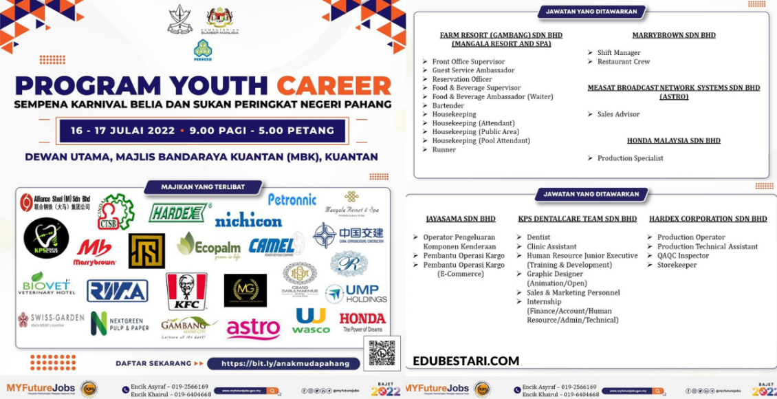 Berita baik buat pencari kerja di luar sana terutamanya graduan dan pekerja yang diberhentikan kerja! PERKESO Pahang akan mengadakan Temu Duga Terbuka Program Youth Career Sempena Karnival Belia dan Sukan Peringkat Negeri Pahang Anjuran PERKESO Pahang secara bersemuka pada 16 & 17 Julai 2022.