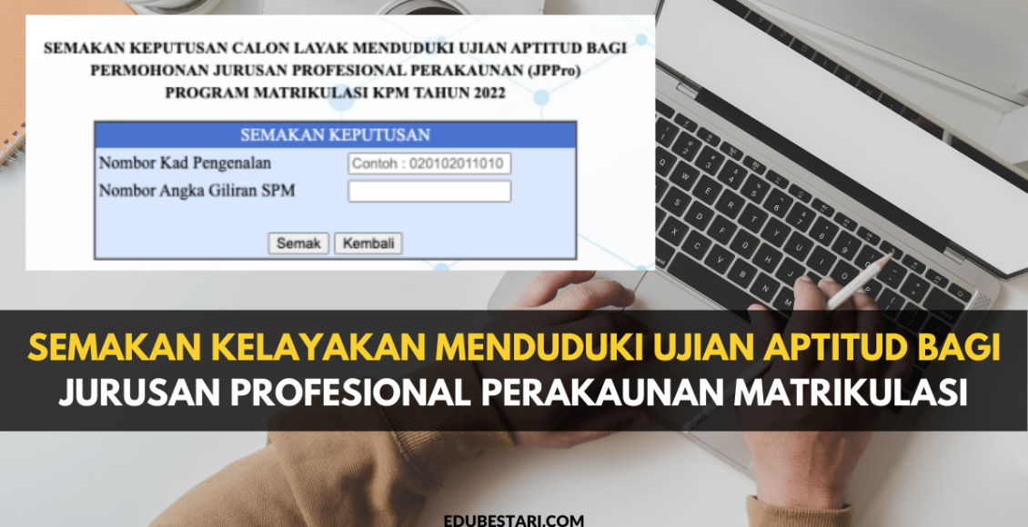 Semakan keputusan calon layak menduduki Ujian Aptitud bagi permohonan Jurusan Profesional Perakaunan (JPPro) Program Matrikulasi KPM tahun 2022 boleh dibuat melalui pautan berikut: