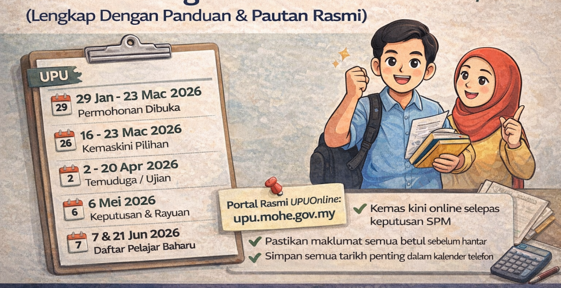 Bagi sesi akademik 2026/2027, terdapat beberapa tarikh penting UPU yang wajib diberi perhatian. Artikel ini menghimpunkan jadual lengkap permohonan UPU 2026, fungsi setiap fasa, serta pautan rasmi supaya anda tidak tersalah langkah.